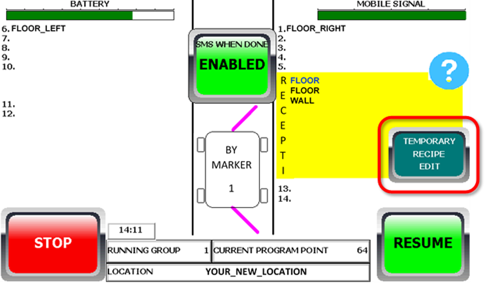 The robot's program is placed in recipes. A recipe tells the robot in which order to run the programs at each marker. The robot will wash in the order you select the recipes. A normal wash should always start with the floor recipe because the floor is the dirtiest.